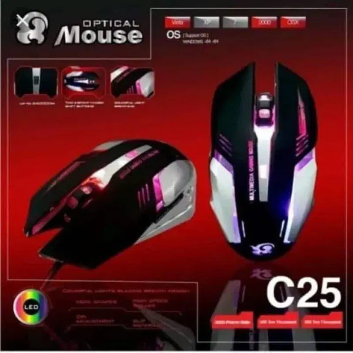 • Material: ABS Plastic• Product Feature: Portable• Color: Multicolor• Package Includes: 1 x RGB Gaming Mouse• Product Description• C25 Optical Gaming Mouse ke sath apna gaming level up karen! Yeh USB wired mouse RGB LED lights aur high precision sensor ke sath aata hai, jo fast aur accurate moves deta hai. Ergonomic design se lambi gaming sessions bhi comfortable rehti hain. Stylish look aur durable build ke sath yeh mouse PC gamers ke liye perfect hai. Plug-and-play setup ke sath abhi gaming ka maza khtm kren!• Highlights / Key Features:• ? High Precision Sensor: Smooth tracking for gaming and work.• ? RGB LED Lights: Customizable colors to enhance gaming vibe.• ? USB Wired: Stable connection, plug-and-play setup.• ? Ergonomic Design: Comfortable grip for long sessions.• ?? Durable Build: Sturdy material for long-lasting use.• What’s in the Box:• 1 x C25 Optical Gaming Mouse• Note: Please ensure to follow the instructions provided in the user manual for proper usage and safety precautions.• Product Code: SS1685200161SCMT
